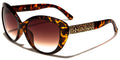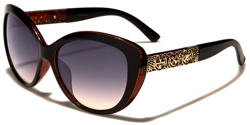 These women's cat eye sunglasses by VG are made of plastic and feature UV400 protection, which helps shield eyes from the sun's harmful ultraviolet rays. The sunglasses come with gradient smoke, amber smoke and gradient brown lenses; and black, brown or tortoise brown frames. All of these sunglasses are adorned with exotic gold embellishments along the arms. These sunglasses are available in one dozen per box, which makes them ideal for retailers.