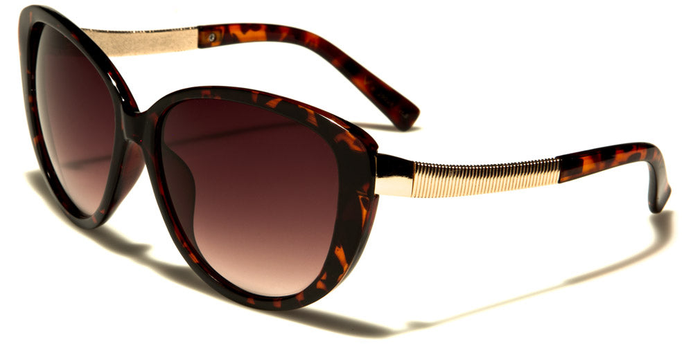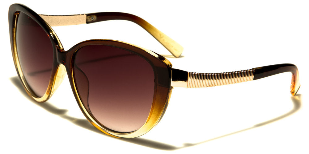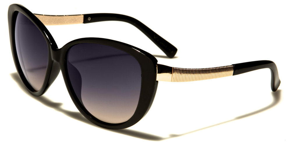 These women's VG cat eye wholesale sunglasses are made of plastic and metal and feature a streamline design. The lenses have a UV400 coating, which offers maximum protection against harmful ultraviolet rays. These sunglasses are available in a wide variety of frame colors, including black, golden brown and tortoise. Lenses are offered in an assortment of colors also, and these sunglasses are available for sale in boxes of 12. The arms highlight a unique banded style metal pattern. These sunglasses are ideal for kiosks, boutique establishments and online retailers.