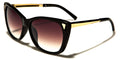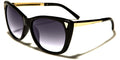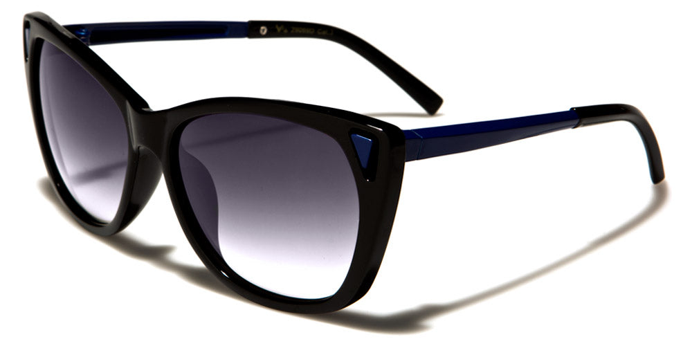 Is there a red-carpet affair in your customer's future? Because these are definitely statement sunglasses. These VG Cat Eye women's sunglasses feature oversized plastic frames with shining metal insets at the temples and triangular accents at the upper corners. The color of the accent triangles changes with the colors of the metal temples; options are black/gold, black/red, black/blue, black/violet/gold, taupe/violet/gold and tortoiseshell/rose/gold. Lenses are gradient blue or gradient violet.