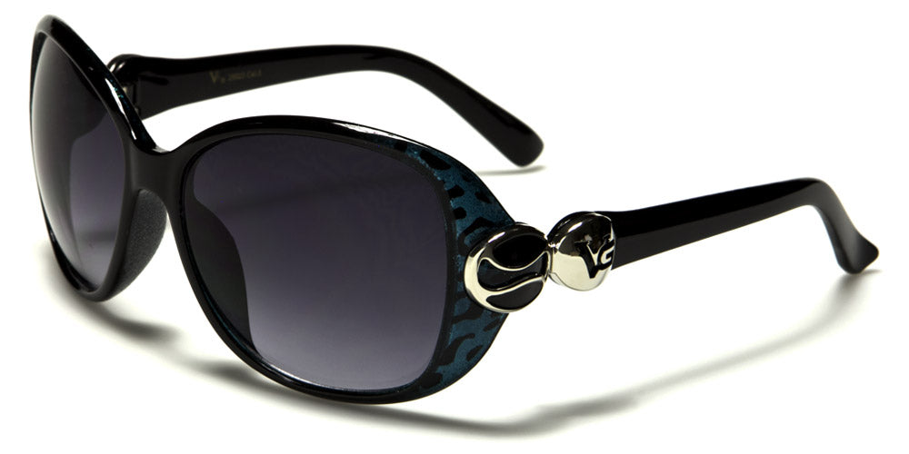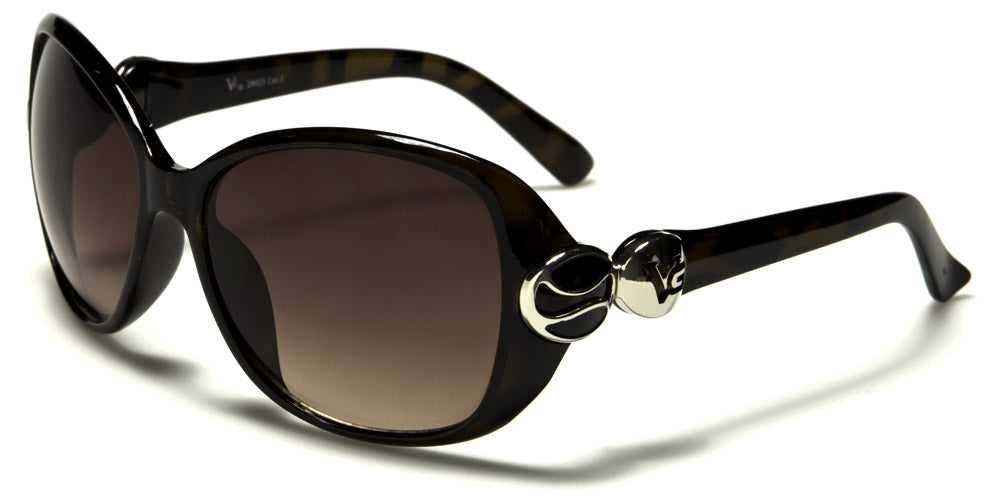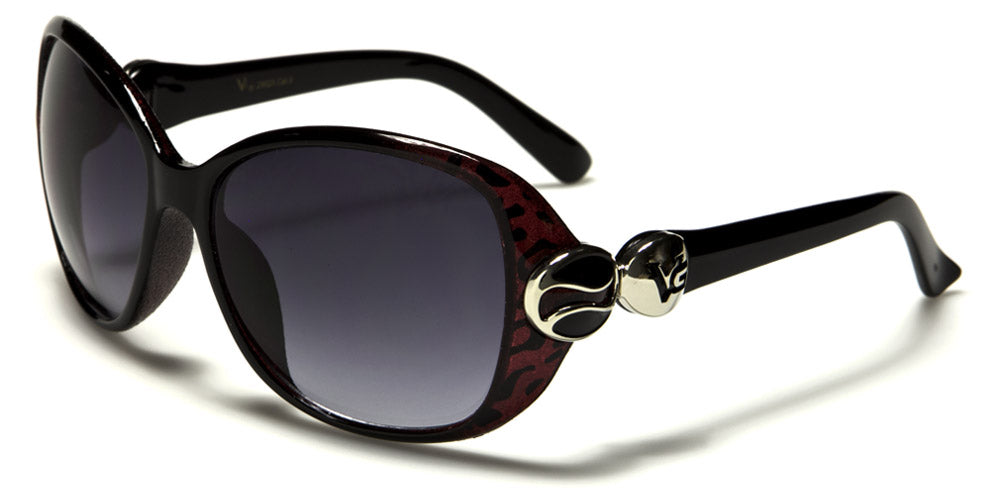 These women's VG oval sunglasses are made of plastic and feature a streamline design. The lenses feature a UV400 coating, which offers maximum protection against harmful ultraviolet rays. These sunglasses are available in a wide variety of accent colors, including red, brown, green, purple and blue. Lenses are offered in an assortment of colors also, and these sunglasses are available for sale in boxes of 12. These shades are ideal for kiosks, retailers and boutique establishments.