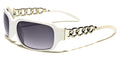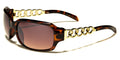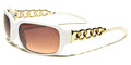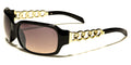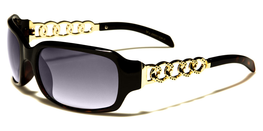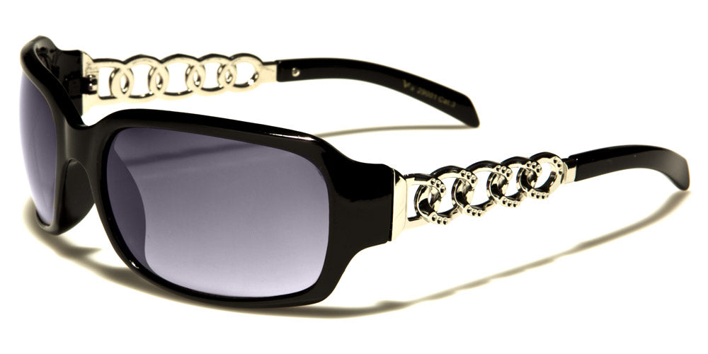 Sophistication meets comfort with these VG sunglasses for women. These feature oval-shaped lenses in thick frames that include a pair of molded nose pads and thick temples. However, the highlight of this pair would be the rhinestone-studded silver or gold chain rings that are intertwined and form half of the arms. Stylish and fascinating, these sunglasses are available in black, white and brown tortoiseshell. The UV400 lenses come in gradient smoke and brown.