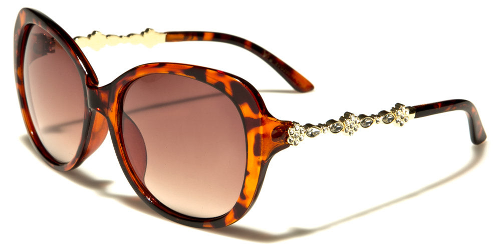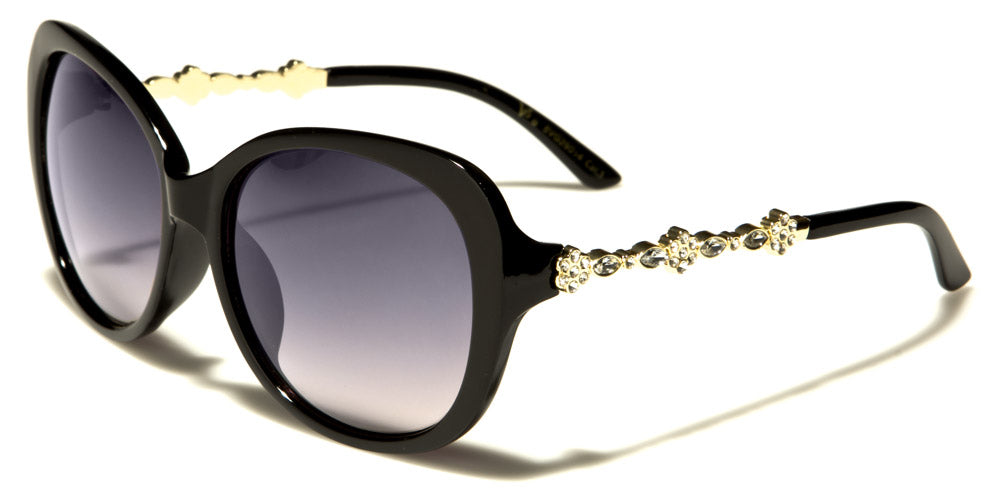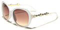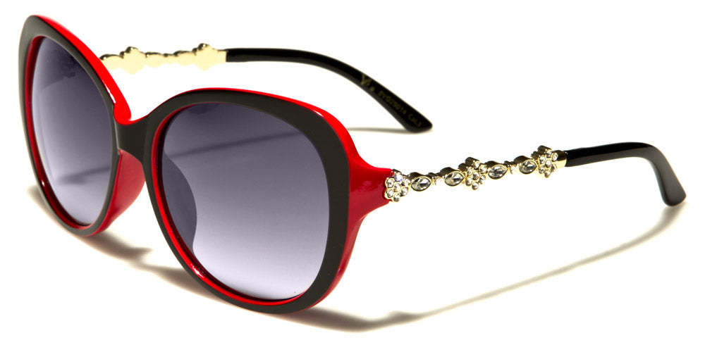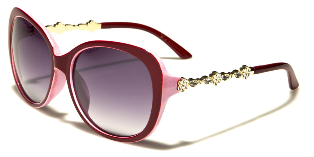 Everything's coming up roses with these VG sunglasses for women! These sunglasses offer a fascinating combination of bold and dainty, starting from the oval lenses that are wrapped in thick frames and the molded metal flowers at the arms that are studded with rhinestones. These sunglasses come in black, white, black and red, maroon and pink, and brown tortoiseshell. Choose between gradient smoke or brown lenses, which come equipped with UV400 protection.