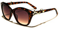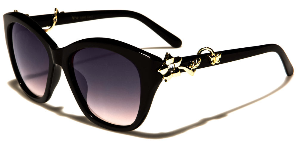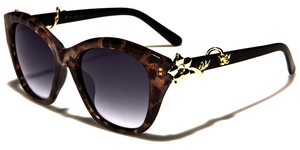 Bloom in these VG round women's sunglasses with metallic flower accents at the temples. This fabulous pair of sunnies features a pair of molded nose pads, a butterfly-shaped bridge, rounded lenses, thick plastic frames and slim arms. The frame colors include glossy black, tortoiseshell brown and an animal print pattern. The gorgeous flower accent hugs the arms with a vine-inspired design and features a rhinestone. These sunglasses also boast of UV400 lenses that come in solid smoke, gradient smoke and gradient brown.