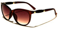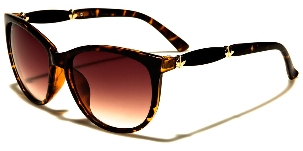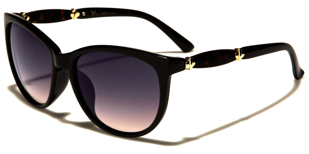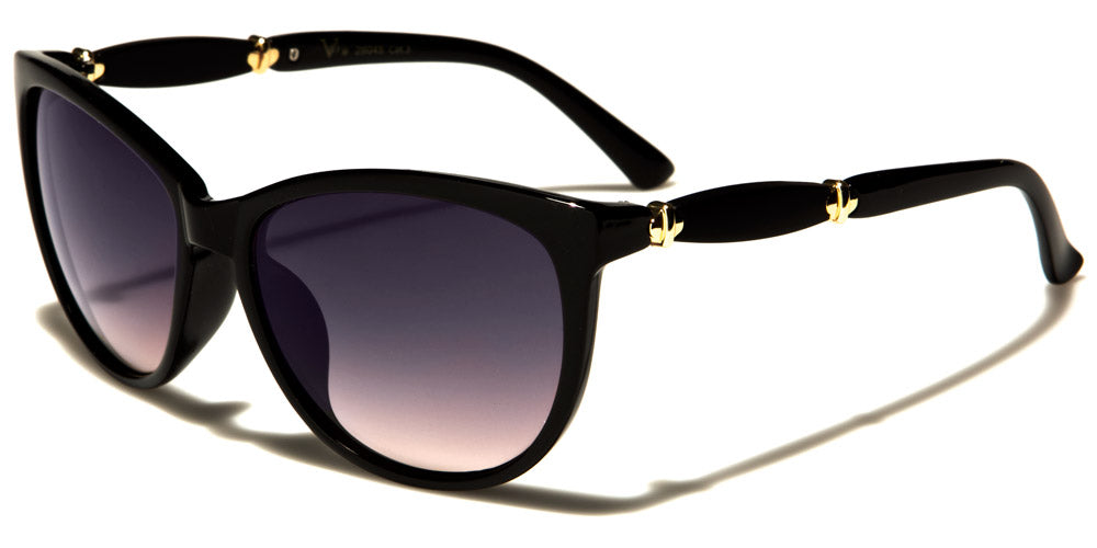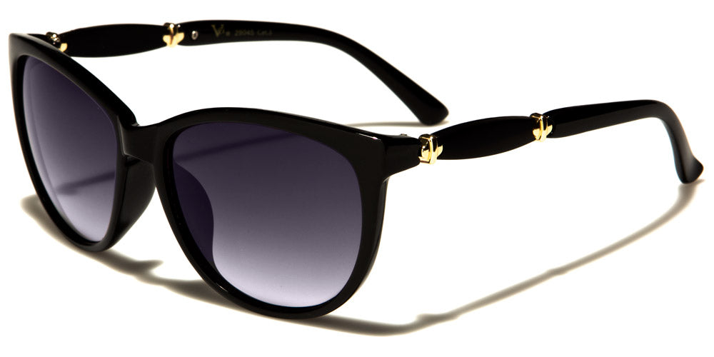 Gracefully curved arms adorned with gorgeous metallic accents add to the charm of these VG round women's sunglasses. These also feature oval lenses, molded nose pads and an outwardly curved bridge in a solid and sturdy plastic frame. The sunglasses come in glossy black, brown and tortoiseshell brown. The sunglasses also boast of 100% protection from the sun's harmful rays with their UV400 lenses. Be sure to stock up on these fabulous wholesale sunglasses for your store.