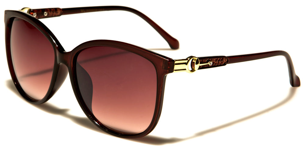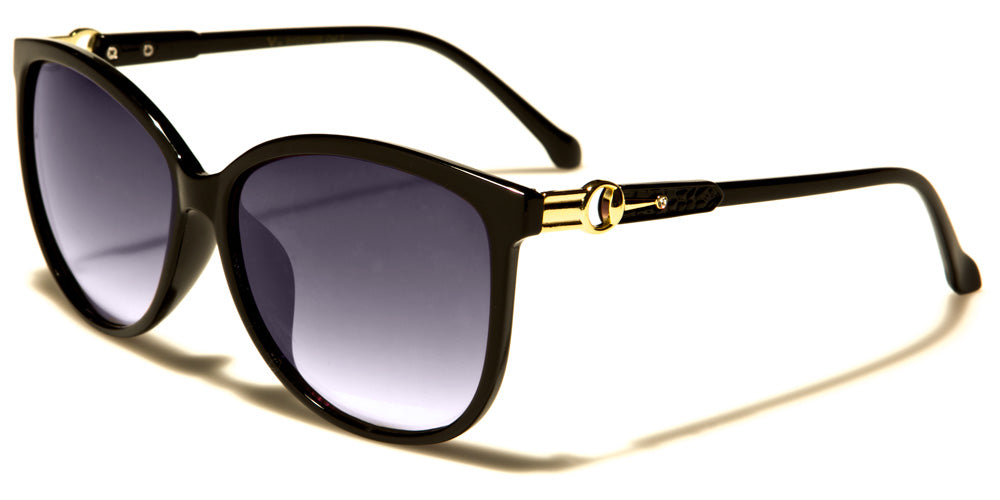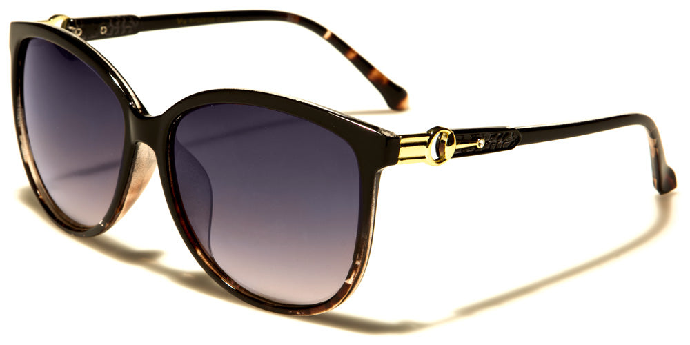Fairly simple frames are played up by sparkling metallic arms on these sober-but-enigmatic sunglasses for women. Round gradient black or amber lenses are set in plastic frames that give a subtle nod to cat eye or retro styles. A molded bridge and molded nose pads provide comfort and stability. A bold metallic half moon and shooting star motif adorn the textured plastic arms, which terminate in long, curved earpieces. Neutral colors go with any outfit. You'll receive a selection of all four color options in your order of this sunglasses style. These sunglasses are sold in bulk by the dozen.