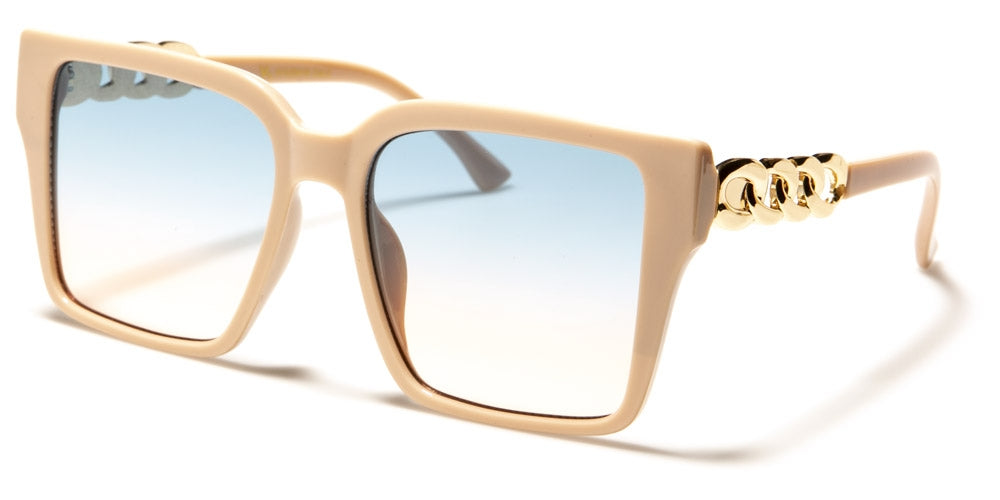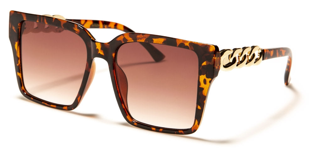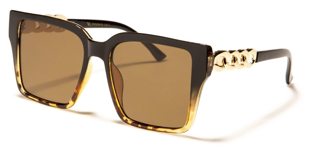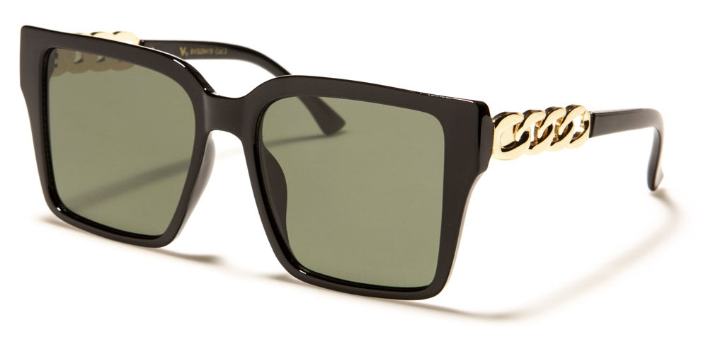 The stylish frames on these VG squared women's sunglasses will appeal to those who love to accessorize with shades that ooze glamor and sophistication. The gold link chain design on the arms adds a touch of elegance to any outfit, ensuring that these sunglasses are perfect for all occasions. Made with a comfortable metal and plastic frame, the glasses offer the ultimate in comfort for the wearer. As well as this, the lenses have been incorporated with UV400 technology to protect the eyes against harmful UV rays. Available in a variety of colors and sold in bulk by the dozen. Bulk orders will be sent with an assortment of the colors shown.