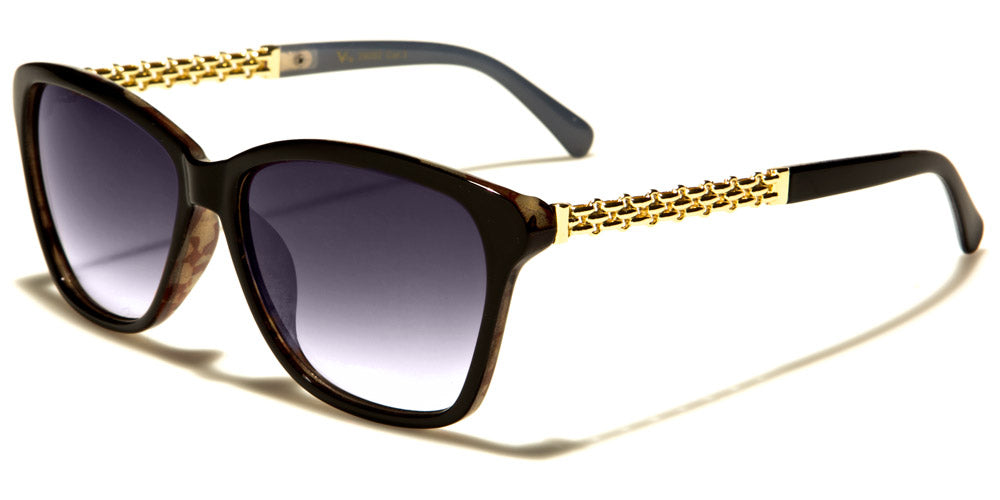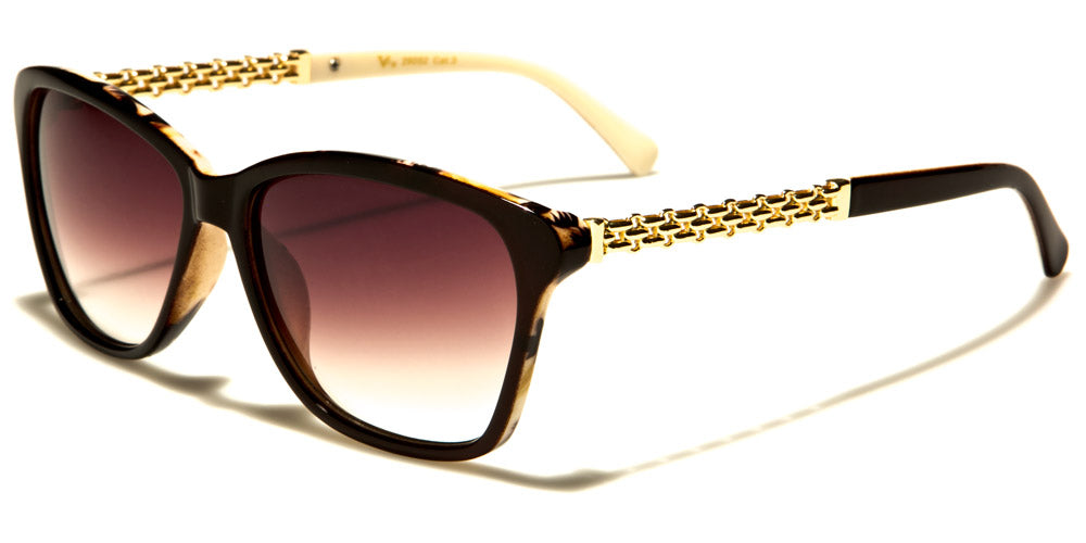 There's lots to love about these sunglasses, including the delicate metal 3D filigree arms, modern classic frames, and fun color combinations. Simple plastic retro frames are slim and trim, with no additional ornamentation. Metal filigree arms connect to slender curved earpieces, which are two-toned in some styles: one color on the outside, one color on the inside. Choose from black frames and arms with dark gray lenses; mottled brown and black frames with black earpieces and dark gray lenses; mottled brown/black frames with black/white two-tone earpieces and deep amber lenses; medium brown frames and earpieces with amber lenses; or tortoiseshell frames and earpieces with amber lenses. These sunglasses are sold wholesale by the dozen.