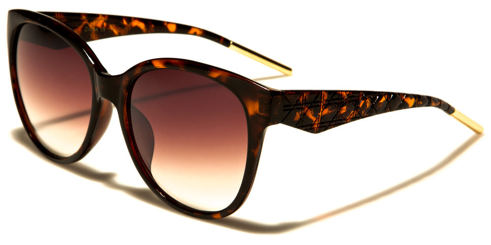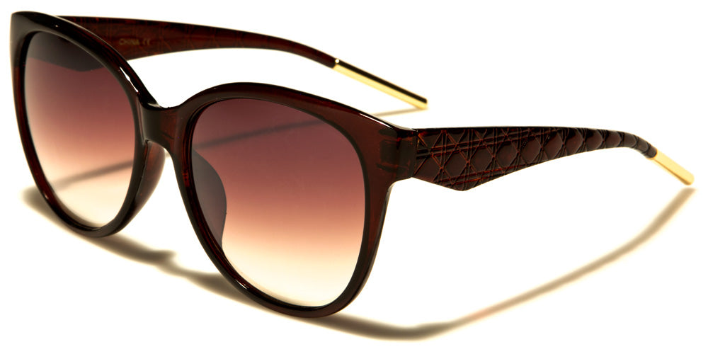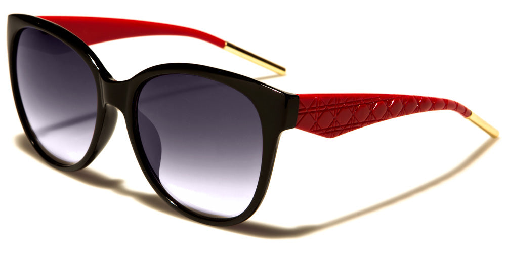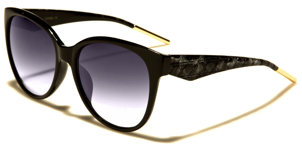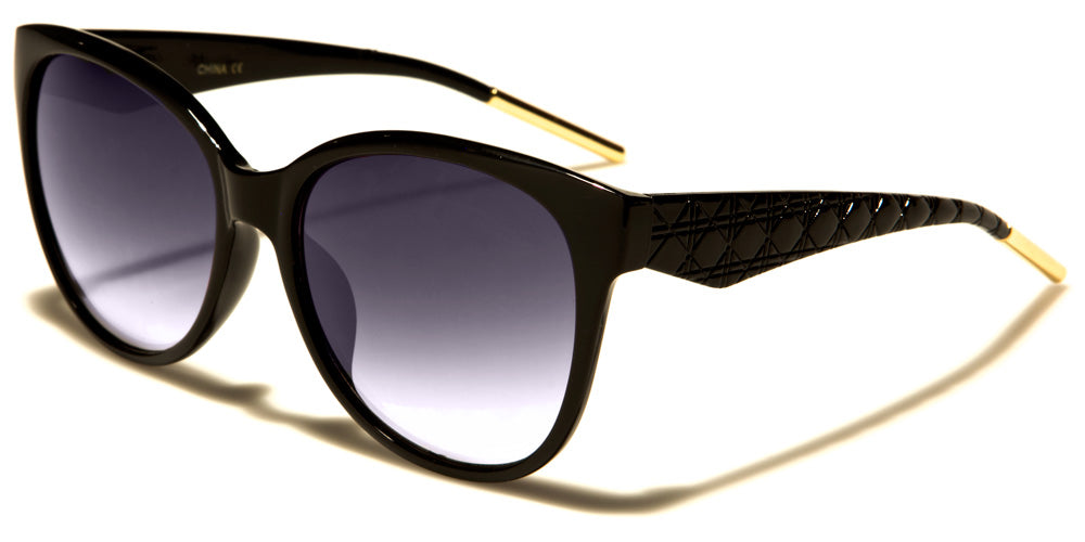 These rounded retro shades sit high on the face to impart movie star glam. Plastic frames include a molded bridge and nose pads for comfort and no metallic accents. It's the arms that really do the talking with these sunnies. Quilted plastic arms narrow sharply into long, cylindrical metallic earpiece tips for just a hint of sparkle. Black gradient or amber gradient lenses pair with various frames and arms colors for a total of six color options in this style. Your order will include a selection of all six of these color options. These sunglasses are sold wholesale by the dozen.