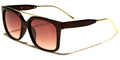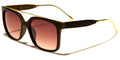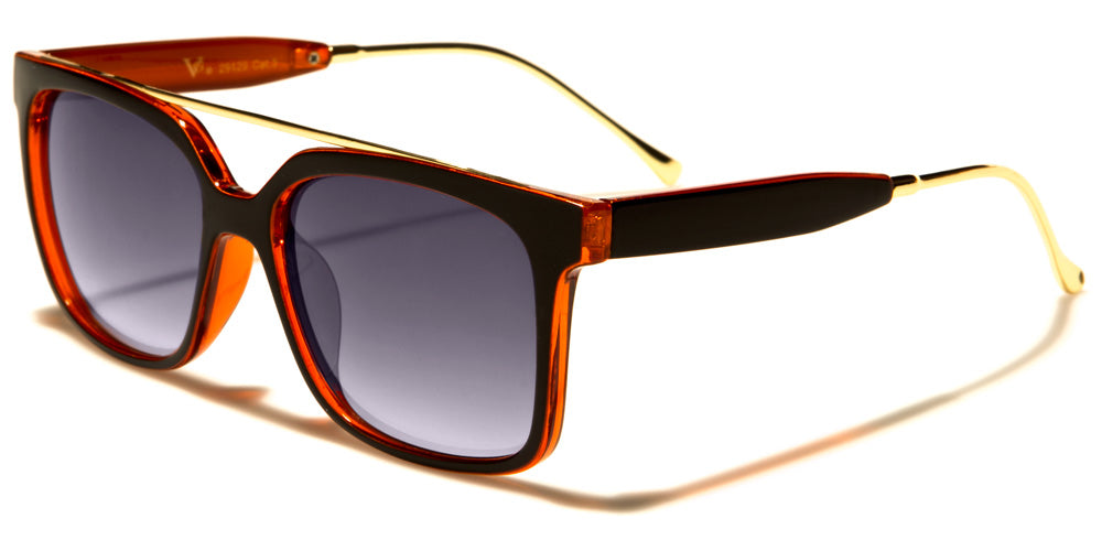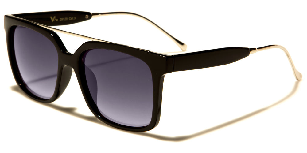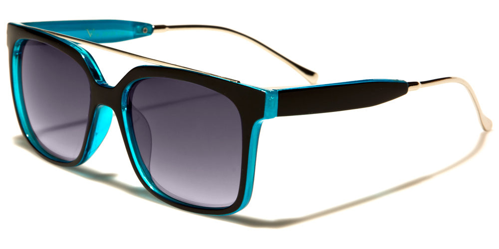 These squared-off classic shades make a bold statement when it comes to shape, color, and materials. Sturdy plastic frames include a molded bridge and nose pads. A bright metallic top bar stretches across nearly the entire length of the top edge of the frames. The metallic theme of the top bar is echoed in the wire earpieces that attach to medium-wide plastic arms. For options with a color accent, the outside edge remains black while color runs along inner edges. Each order contains a selection of all five color options available in this style. These sunglasses are sold in bulk by the dozen.