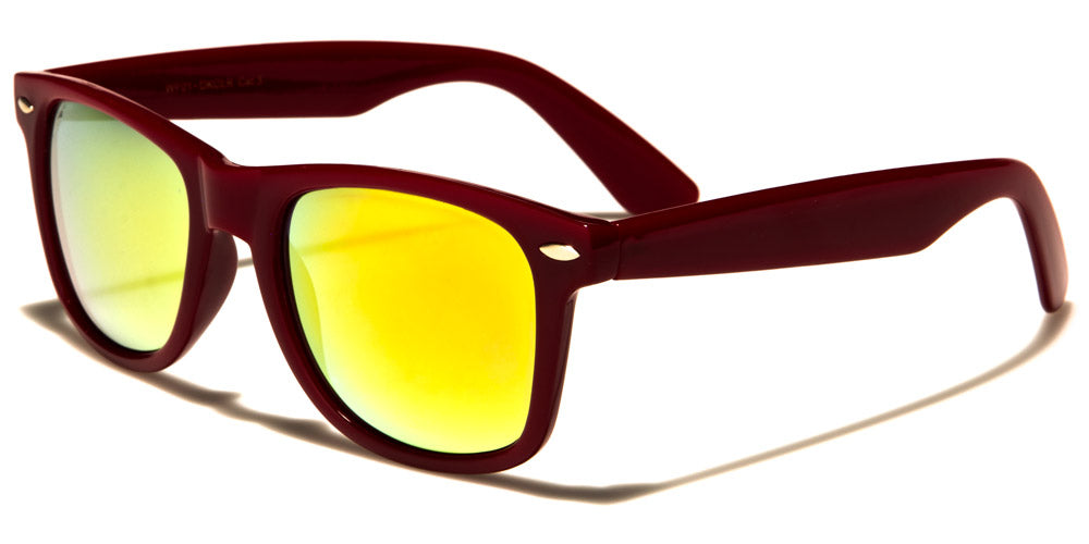 These color-mirror unisex retro sunglasses are made of plastic. The lenses offer UV400 protection, which gives people greater peace of mind when wearing these modern-day sunglasses. Color options include red with revo yellow lenses, dark green with revo blue lenses, navy with revo blue lenses, and deep purple with revo orange lenses. These sunglasses are super trendy and are bound to make a statement this season! These sunglasses are available in quantities of one dozen per box.