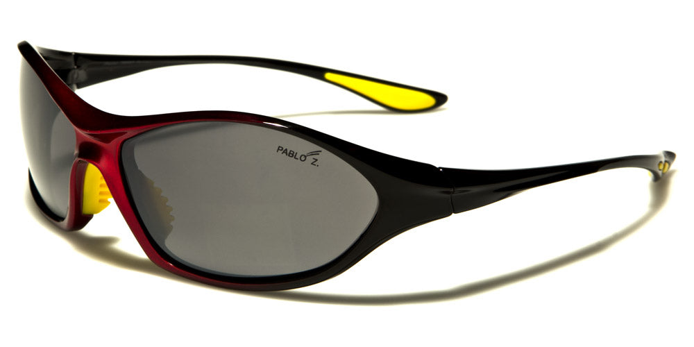 These Pablo Z TR-90 plastic sports sunglasses for men are similar to what you might see in a comic book. Their unique shape is sure to make you stand out when you walk through a crowd. You have the option to buy so many different colors of these shades, including black, gunmetal, silver, red, blue and white frames. With this wide range of selections, you have the choice to get more outfits than you might have previously expected. These lightweight sunglasses are damage-resistant, and the frames or arms will not break in your gym bag or melt in your car. These glasses are sold by the dozen per box.