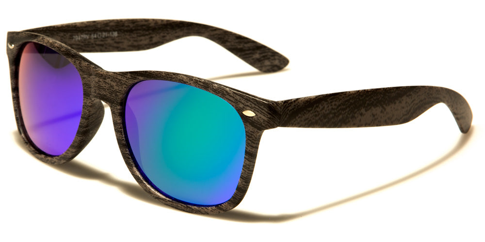 Traditional classic frames are married with a faux wood print in these striking shades for both men and women. Mirrored lenses add a strong shot of color to the various wood tones of the plastic frames. Medium-wide arms widen slightly before angling into curved earpieces. Pinched oval metallic accents at the outer corners enhance the traditional retro styling. Each order arrives with a selection of all six color options for this style. These sunglasses are sold wholesale by the dozen.