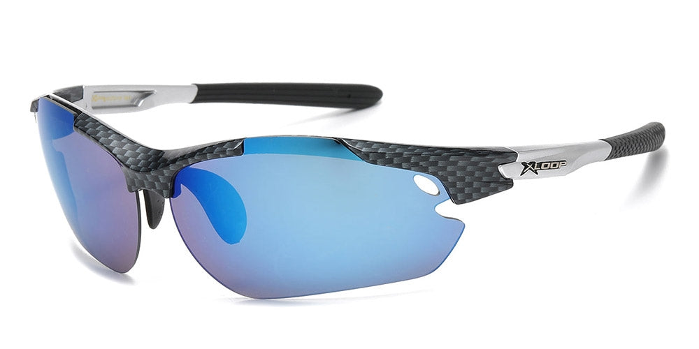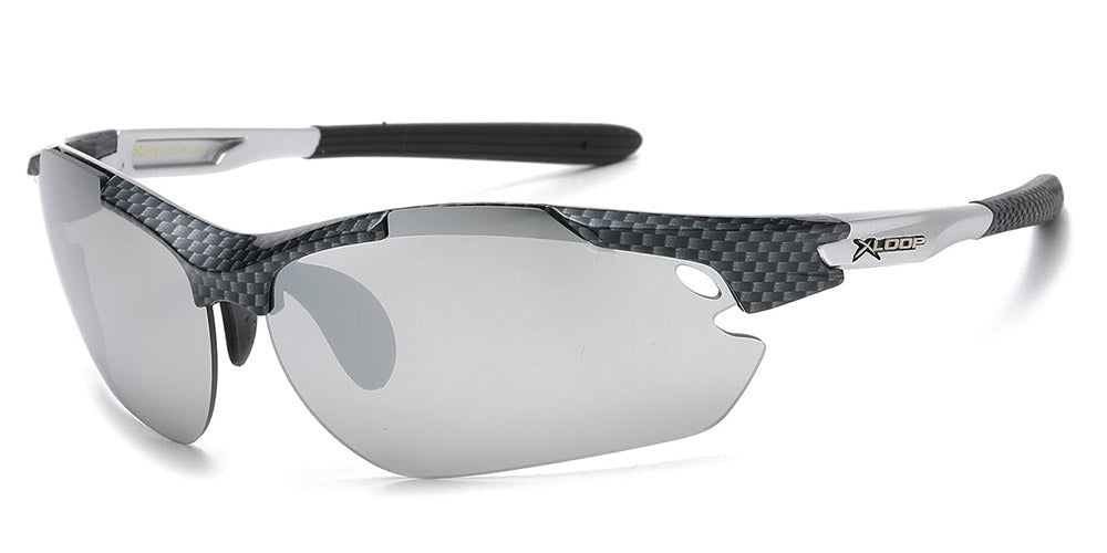 Add aggressive sport styling to your eyewear assortment with these X-Loop carbon fiber print sport sunglasses, designed with a semi-rimless wrap frame that delivers a streamlined athletic look. The curved sport profile helps the frame sit comfortably on the face, making this style appealing to customers searching for sunglasses suited for driving, outdoor activities, travel, sports, and everyday sunny wear.