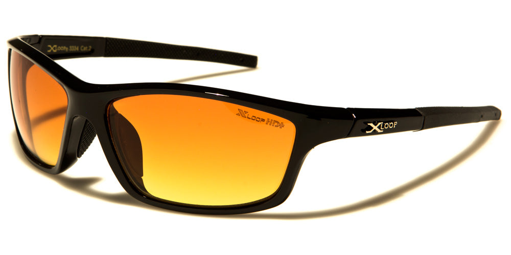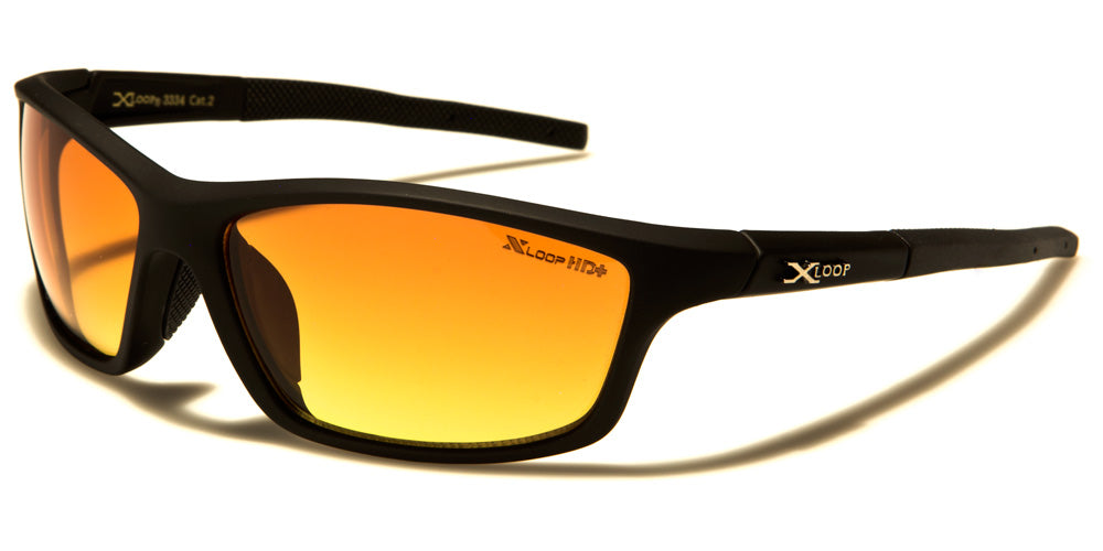 Wrap sunglasses are ideal for outdoor sporting activites and driving because they provide maximum protection around the eye and fit close to the wearer's face. These comfortable and durable shades from X-Loop come in three black styles, shiny, matte and transparent, and have orange-tinted lenses. This improves contrast in darker conditions and filters blue light to increase focus, which is very helpful when riding a bike, driving on a cloudy day, or playing a winter sport. These sunglasses are sold wholesale by the dozen.