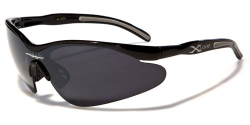 These cool dark shades by X-Loop are designed for active men to be worn during sports or other activities. The frame is made of durable plastic and is molded to fit comfortably and securely on your head. The arms are straight and light with design elements that are attractive and functional. The X-Loop logo is prominently displayed on the side next to the pads on the earpiece. The lenses are dark and set in the semi-rimless frame, perfect for privacy and to protect your eyes.