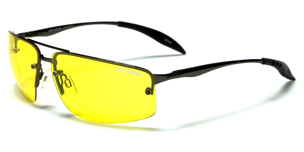 These BeOne men's driving sunglasses have been designed with inclement weather and driving conditions in mind. Featuring a semi-rimless, lightweight metal frame, contoured plastic ear pieces, adjustable nose pieces and polarized lenses to protect your vision from unexpected glares, these sunglasses will quickly become your favorite driving accessory. BeOne has placed its distinctive logo on the upper left corner of the left lens, letting everyone know you have chosen a superior product. A gunmetal and black plastic frame with yellow colored lenses complete these quality sunglasses.